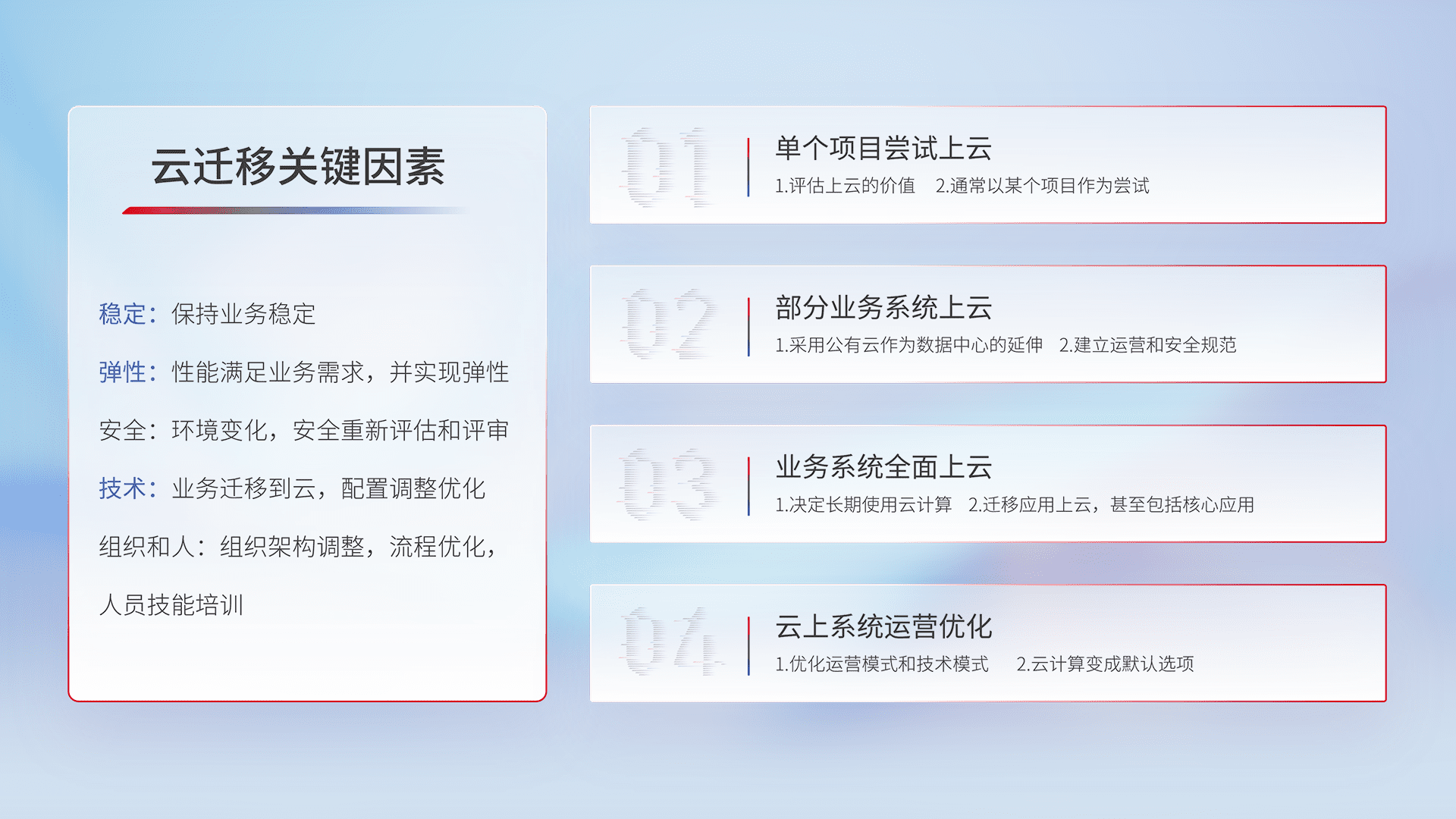结合实际业务,,,从规划设计、、云平台选型、、、云原生改造、、、数据迁移、、集成交付,,迁移全过程为客户识别最佳上云路径,,做好风险识别管理,,,设计网络架构、、、、身份权限、、、、安全审计合规、、、操作审计、、、日志审计、、监控告警策略、、多站点容灾设计等,,对云上基础设施进行整体规划,,,,提升IT治理水平,,以满足弹性、、、高可用、、、高性能的需求。。。。