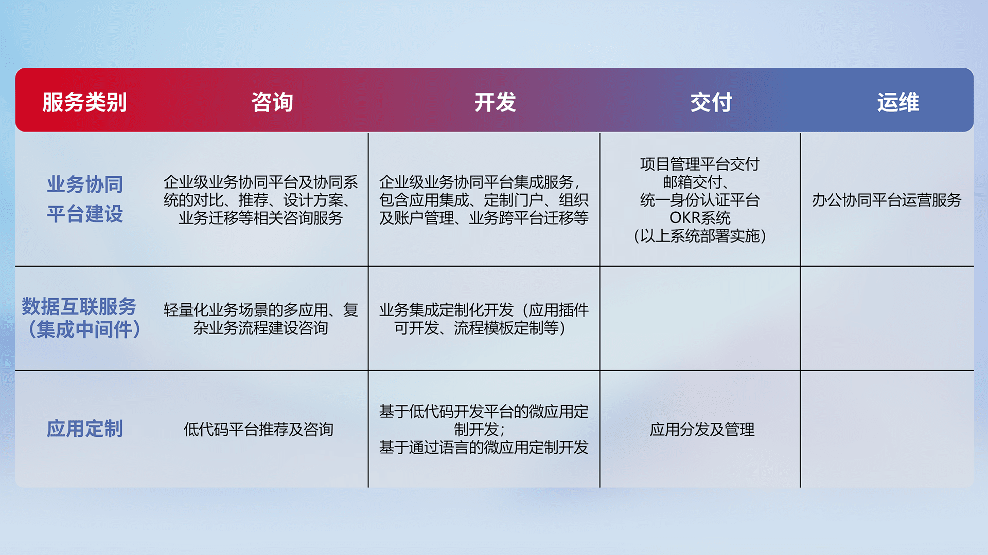 针对钉钉、、企微、、、、IDaas等平台级产品提供产品的规划、、方案、、、、交付、、、定制化开发等服务,,,,实现如统一协同办公、、、智能客户服务、、混合会议管理、、智能数据查询、、等业务场景,,实现数字化转型。。。。